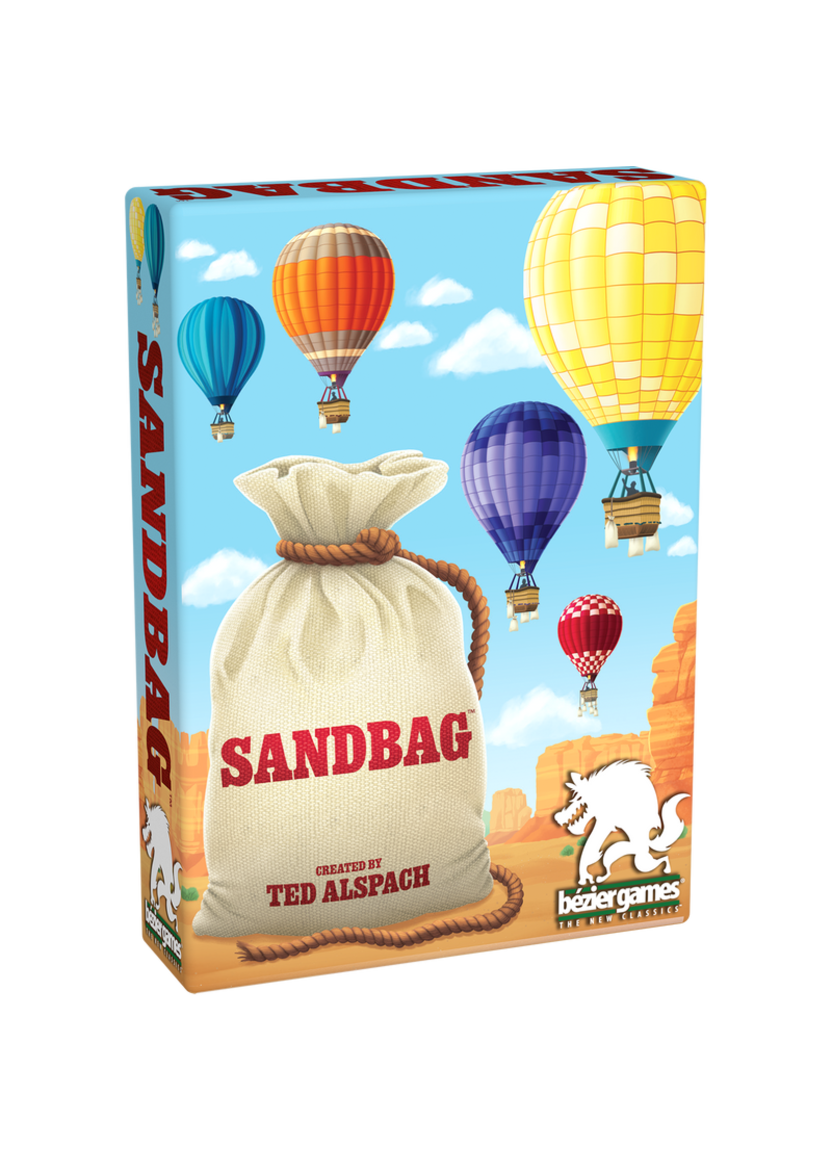 Sandbag is a trick-taking game of avoiding tricks, manipulating trump, and reconfiguring your hand of cards. In each of the three rounds, you'll configure your basket with two face up cards; the most common color of all players' cards is the trump suit. Each trick, players either play from their hand, play a Sandbag (to sluff, or avoid winning the trick), or play one of their opponents' face up cards. Each round, it's possible for the trump to change as the number and kind of face up cards are exchanged for face down sandbags. There are also 5 rocket cards in play each round, worth negative points (that's good for you); you'll need to try to win those while avoiding all of the other sandbag cards!